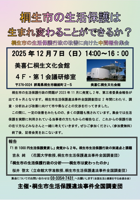 群馬県桐生市の生活保護行政における数々の違法・不適切対応を調査・検証し、改善を働きかけてきた「桐生市生活保護違法事件全国調査団」の報告会を12月7日(日)、桐生市で開催いたします。
