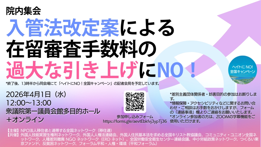 私たちは、日本に暮らす外国人の生活に不可欠な在留資格の手続き費用を、十分な説明もないまま急激に引き上げる法案に強く反対します。本院内集会では、日本政府の外国人政策の課題や、今回の法案の在留審査手数料引き上げの問題点、外国人当事者および日本社会への影響を明らかにし、法案の国会での十分な審議を求めます。みなさまのご参加をお待ちしています。